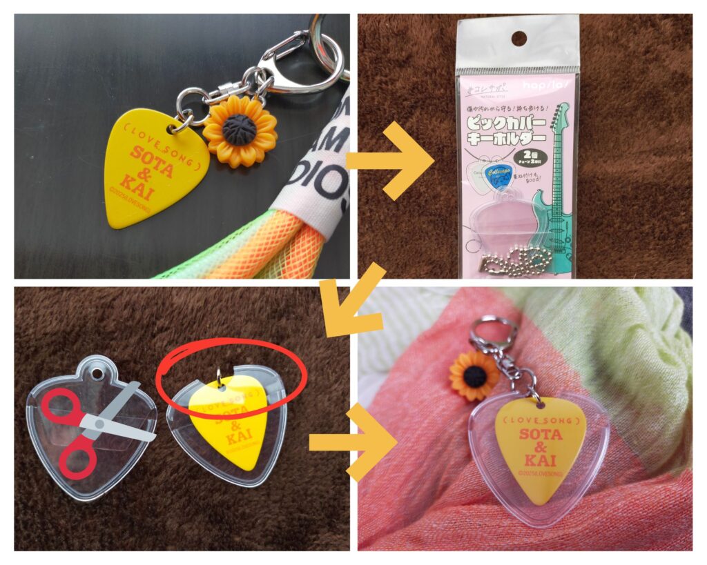 いま、スマホに付けてます。印字されている文字がかすれちゃったら嫌だなーと思っていたら、ピックカバーなるものを発見。キャンドゥで販売されているもので、その名の通りピックを保護してくれるものなのですが、丸カンを通す穴がちぎれたらちょっと嫌だなぁと思って、ぐりんっとハサミでくり抜いて、写真のように仕上げました。